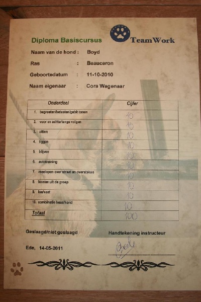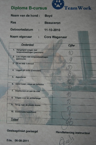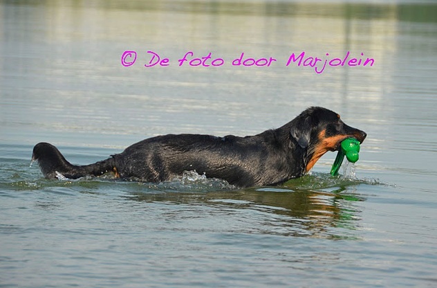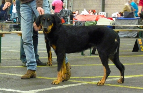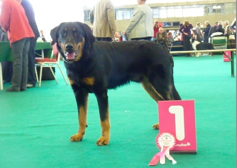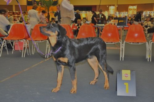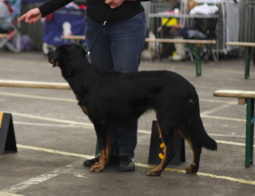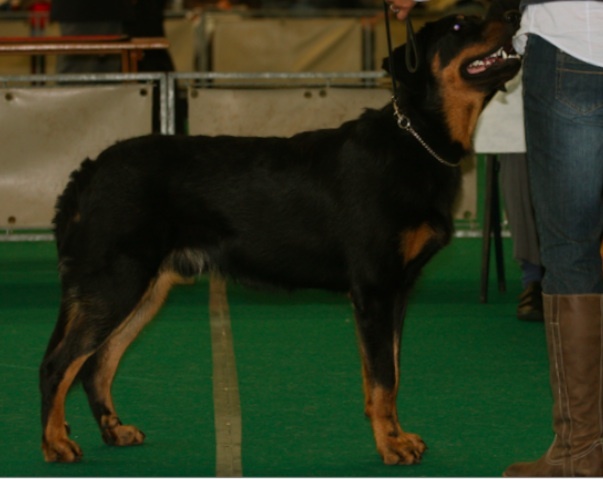 Zeer fraai rasbeeld, voor leeftijd goed ontwikkeld, krachtig en gespierd, goed hoofd met mooie expressie, sterke bovenbelijning, rechte benen, iets schraal in conditie, mooie brand, goede h.k's, staart wordt mooi in een J gedragen, gangwerk met veel kracht en goede paslengte, gedrag goed, mist nog wat ringtraining. ----------------------------------------------------- Very beautiful example of the breed, well developed for age, strong and muscled, good head with beautiful expression, strong topline, straight legs, a little slim in condition, beautiful tan, good dewclaws, tail is nicely carried in J, allure with power and good amplitude, good behaviour, lacks some ring training.