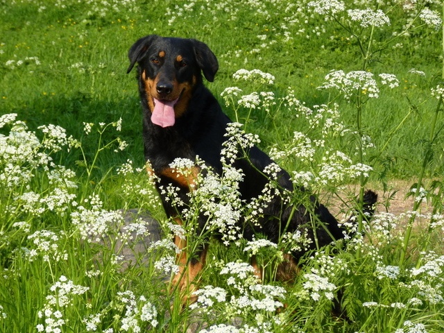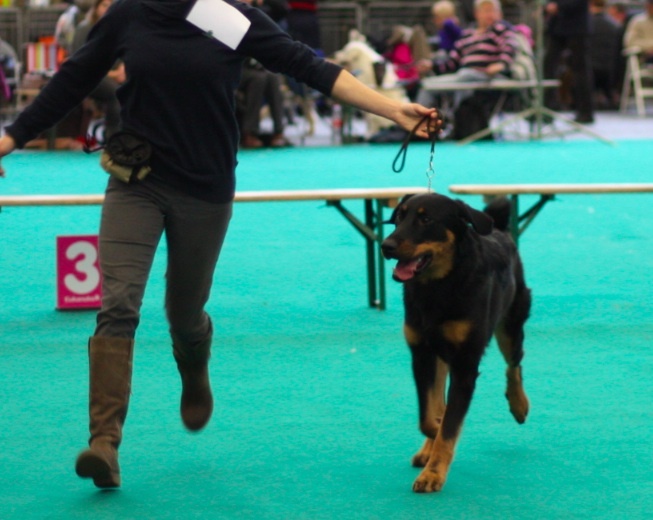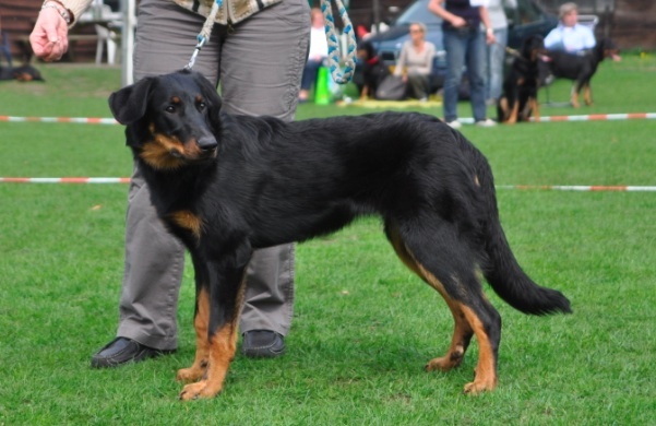 Masculin. Excellent head, good expression, excellent neck, excellent chest for his age, excellent angulation, good bone and feet, excellent double d.claw, excellent in movement, excellent colour. Qualifié pour Crufts ( si beaucerons etaient jugé).